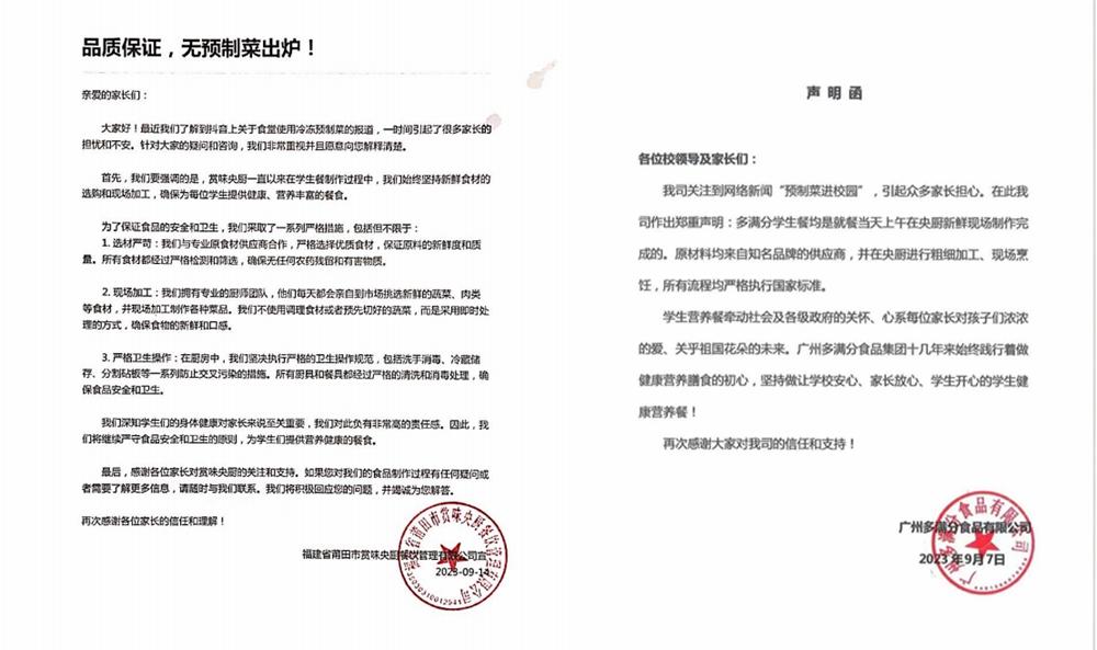 目前,还有多家餐饮公司回应。9月7日,广州多满分食品有限公司发声明称,学生餐均是就餐当天上午在央厨新鲜现场制作完成的。