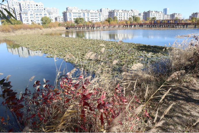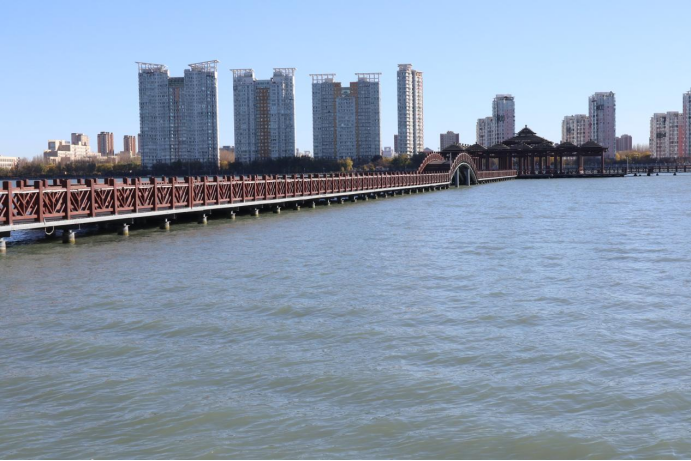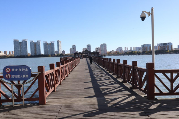 随行的大庆市水务局河湖保障科副科长沈阳说,“黎明湖上1316米木质栈桥独具特色,古朴典雅的大型休闲廊亭是市民的打卡地。环湖而建的大学城、博物馆、商业街应运而生,湖边广场还有体育场馆,多次承办国家级体育赛事。可以说,通过景观河湖治理,这里已经实现城市社会、经济、文化等多方面全面提升,成功打造出具有大庆特色的幸福河湖模板。”