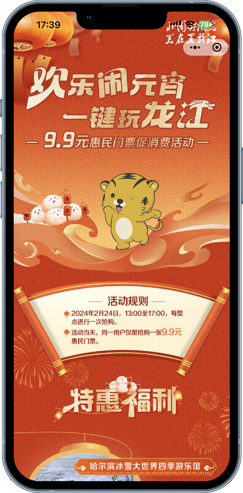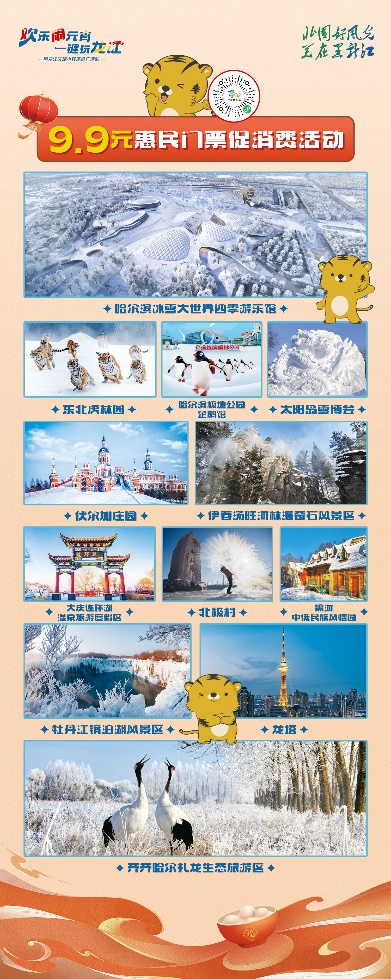元宵佳节龙江热,数字寓游文旅兴。2月24日下午,由黑龙江省文化和旅游厅主办的“一键玩龙江”黑龙江文旅小程序推广活动在哈尔滨市成功举办。“精彩不停,感恩有你”9.9元惠民门票促消费活动于当天正式上线,包括哈尔滨冰雪大世界四季游乐馆、哈尔滨极地公园·企鹅馆、东北虎林园等十余家省内重点景区共同发起9.9元限量门票特惠福利,邀请游客龙年游龙江,有效拉动全省旅游消费。