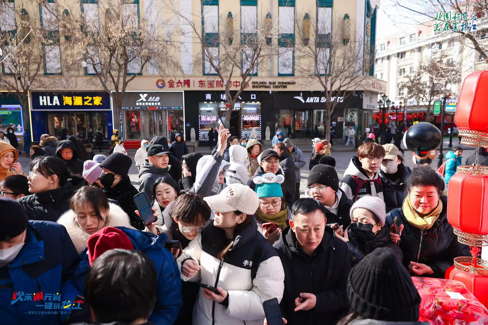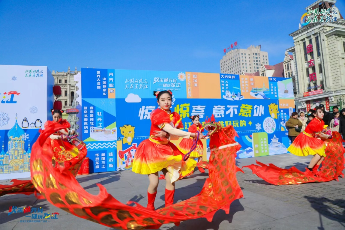 小金豆舞蹈表演、舞狮、舞龙旗……在索菲亚教堂广场,集聚元宵元素和南北特色的表演不断上演,拉开了黑龙江文旅小程序推广活动的序幕。