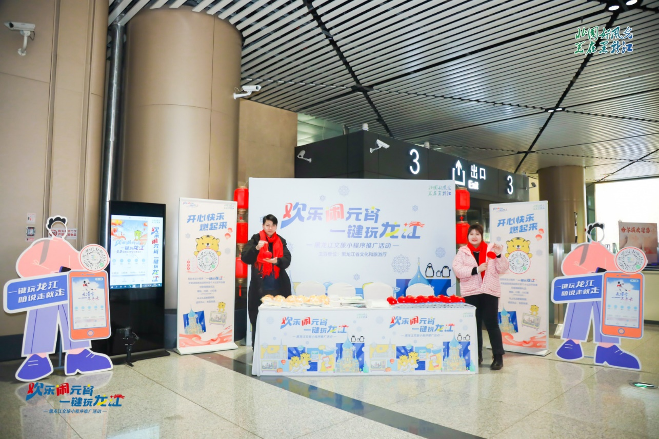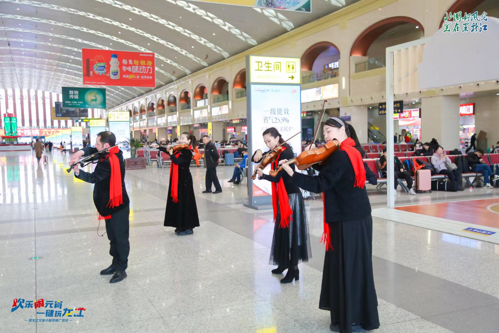 在哈尔滨西站、哈尔滨火车站、哈尔滨太平国际机场活动现场,小提琴表演艺术家的现场表演吸引游客驻足观赏,黑龙江特色打卡区前互动参与不断,工作人员通过派发小灯笼、文创小蛋糕等新春礼物,向游客推介龙江文旅小程序,邀请游客关注“一键玩龙江”。