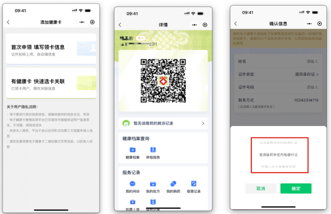 (一)电子健康卡。电子健康卡是居民在医疗健康行为中专属的个人二维码,居民凭电子健康卡可以在医疗机构挂号就诊、移动支付、诊间结算、查询就医信息等,可以网上预约挂号、缴费、查询就诊信息等,也可以享受疫苗预约、家庭医生服务、电子健康档案查询等公共卫生服务;支持居民通过身份证、港澳通行证、台湾通行证、军人相关证件、护照等申领电子健康卡。