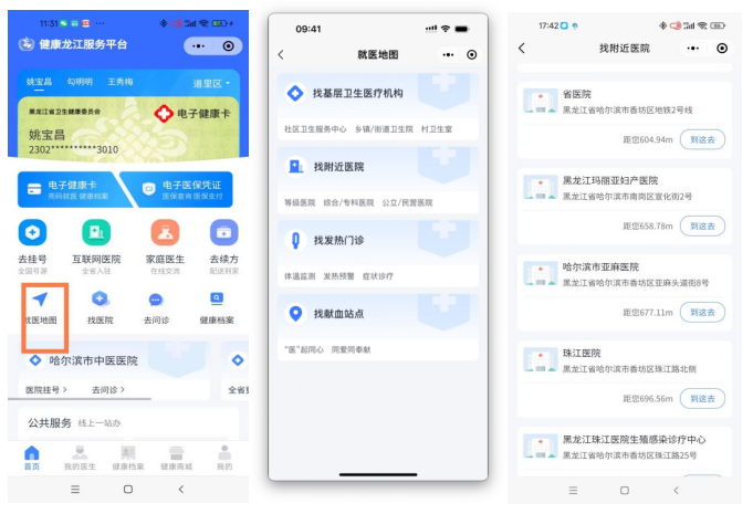 5.就医地图。居民可以查询附近的医院、发热门诊、基层医疗卫生机构、献血站点等,并通过电子地图导航前往。