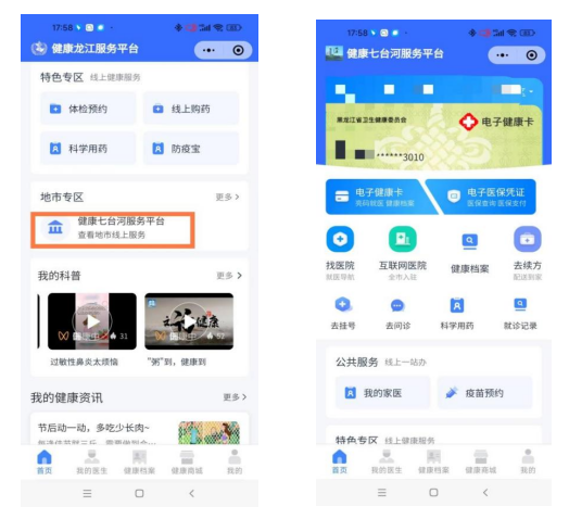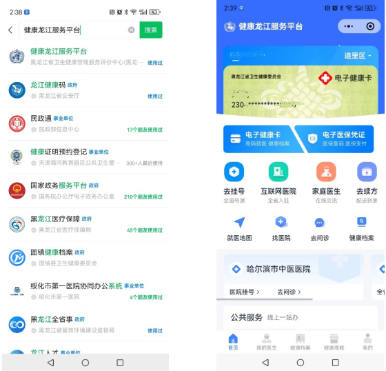 微信用户可搜索“健康龙江服务平台”小程序或者微信公众号,支付宝用户可搜索“健康龙江服务平台”小程序进入平台,以下是微信小程的操作和功能介绍: