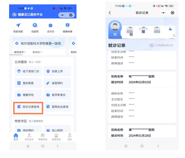 7.就诊记录查询。居民可以查询个人和家庭成员就诊记录。