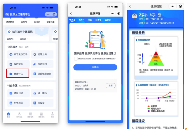 5.健康评估。居民可对个人健康状况进行评估,生成评估报告。