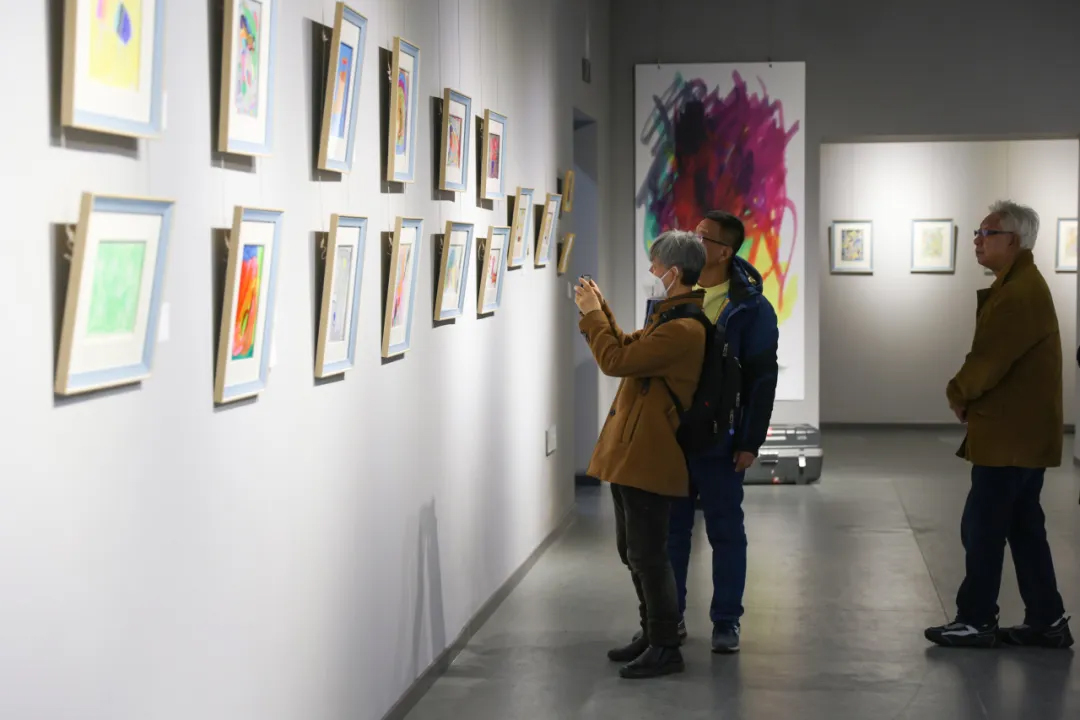 展览分为三个展区,展出“随心涂鸦”精选作品120幅,参展作者是来自“筱齐原生艺术工作室”的40名心智障碍原生艺术家,他们从绘画零基础起步,在一张张白纸上天马行空自发涂画,向外界打开了一扇窗,展现了他们心灵世界的纯净美好。开幕活动中,受邀参展的作者们现场共同创作了一幅长卷作品,用手中的画笔描绘他们眼中的世界、传递他们对生活的热爱。