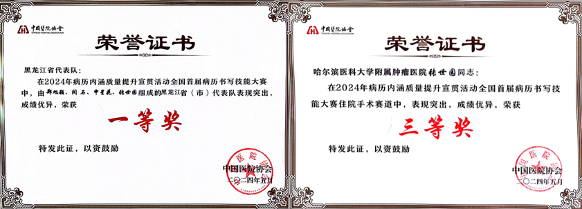 黑龙江网讯(程岩 记者 王可欣)5月10日—5月12日,由中国医院协会医疗质量与患者安全专业委员会在北京举办以“落实医疗质量安全核心制度,持续提升病历内涵质量”为主题的“2024年全国病历内涵质量提升宣贯活动”,黑龙江省代表队获得2024年全国首届病历书写技能大赛团队一等奖;哈尔滨医科大学附属肿瘤医院张世园获得住院病历(手术)赛道个人三等奖。