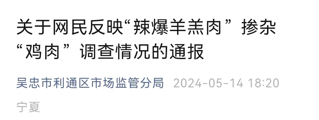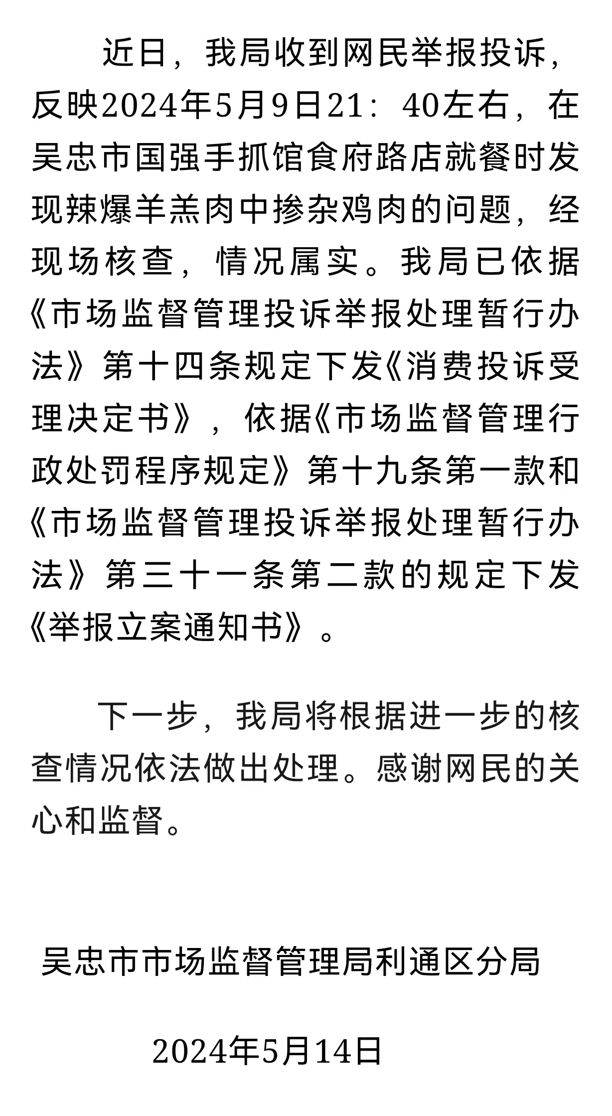 5月15日,记者了解到目前该事件有最新进展,5月14日晚上,宁夏吴忠市利通区市场监管分局微信公众号发布《关于网民反映“辣爆羊羔肉”掺杂“鸡肉”调查情况的通报》称,经现场核查,情况属实,将依法处理。