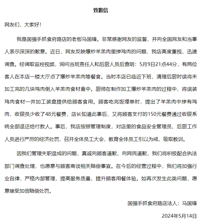 同时,国强手抓食府店负责人也发文致歉并就当时情况进行说明。