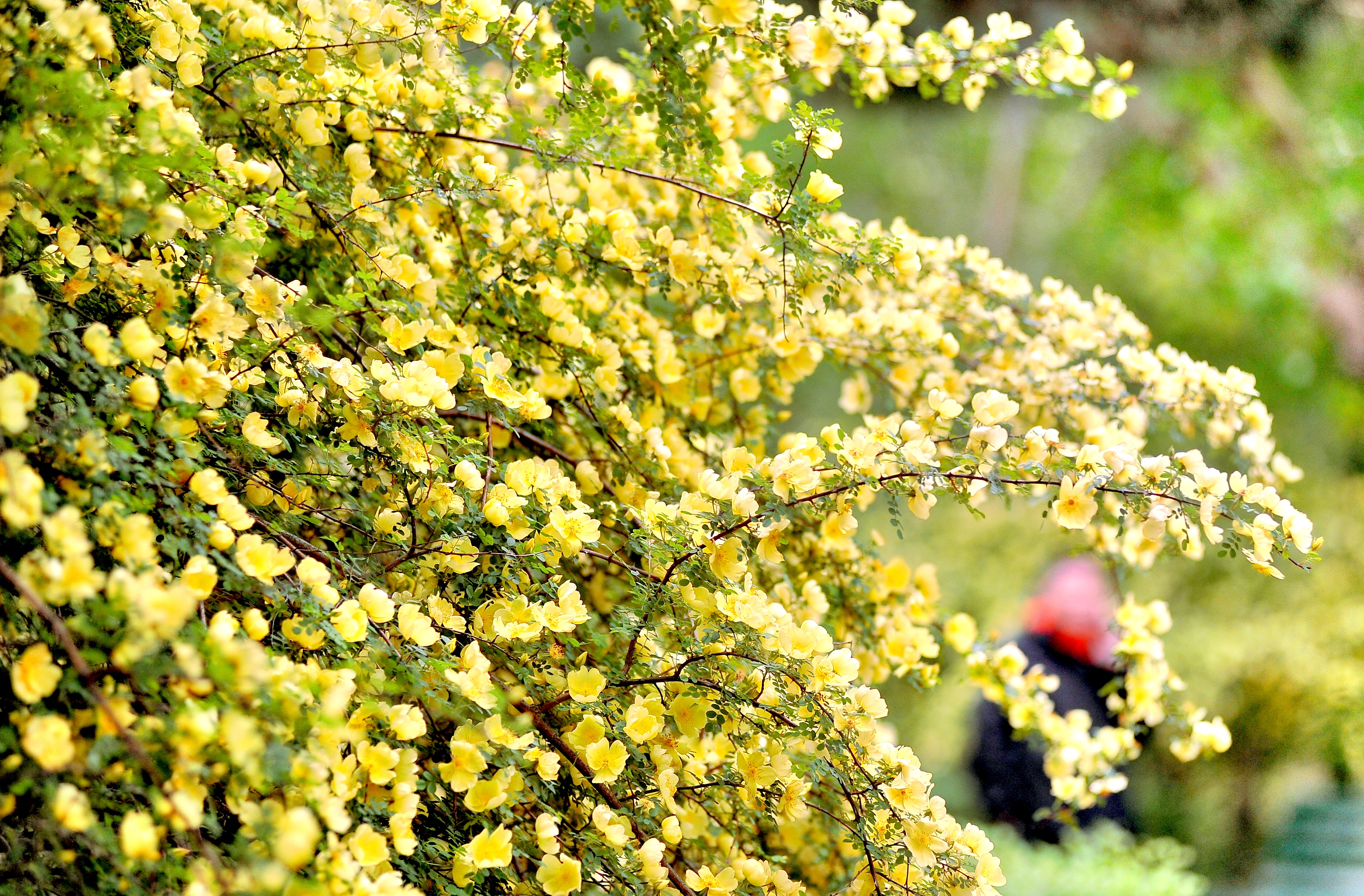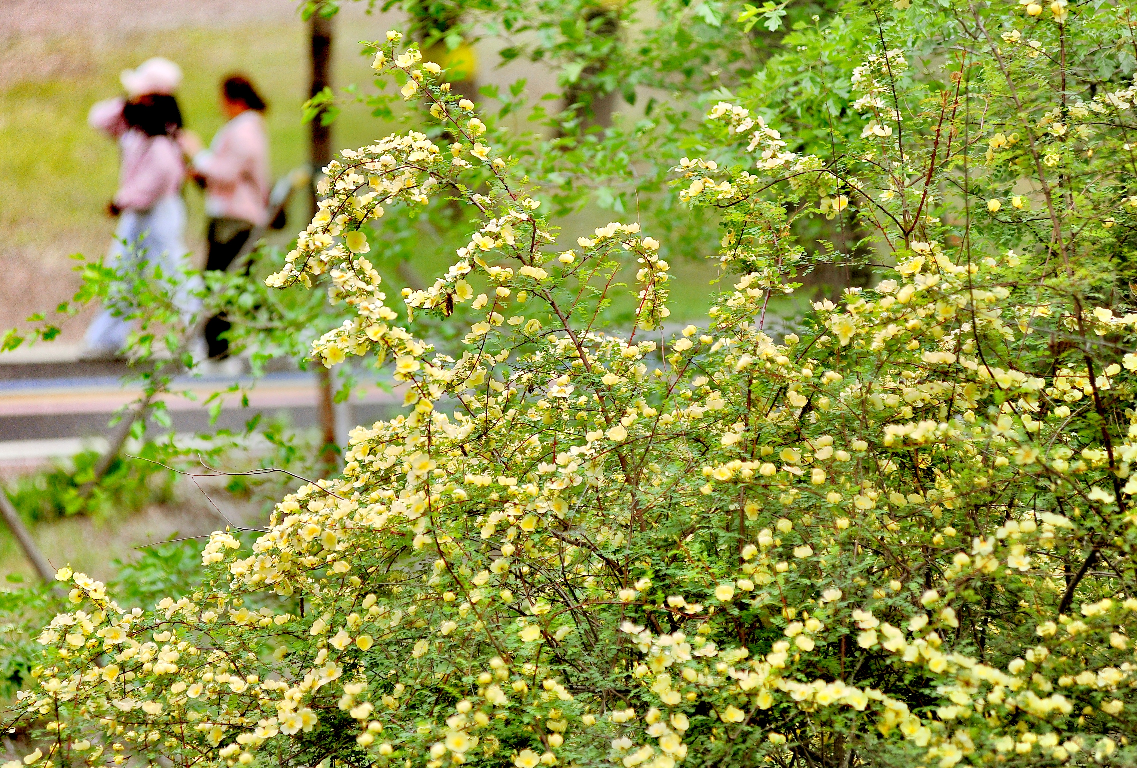 14日,在哈尔滨市道里区顾乡公园内,数十棵黄刺玫树上开满黄色的花朵,吸引了不少人驻足观赏。