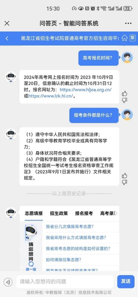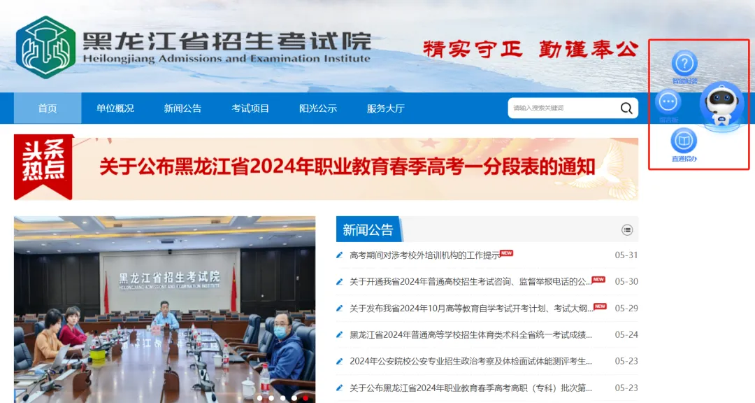为方便广大考生了解黑龙江省新高考的相关信息,黑龙江省2024年高考智能问答系统正式上线啦!有问题的同学可以自助使用,对于解答不了的问题,省招考院也将逐渐丰富题库,努力为大家提供优质的服务。