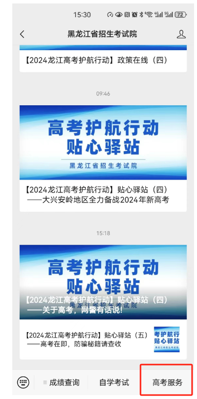 关注“黑龙江省招生考试院”微信公众号,点击菜单栏“高考服务”,即可进入。