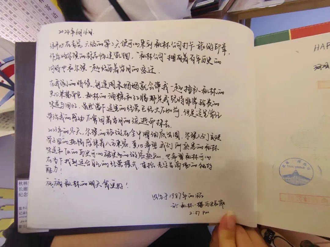 “在我很小的时候,每逢周未,妈妈就会带我一起排队购买秋林的夹心果酱面包、酒糖和红肠,它们都是我儿时非常珍贵的味道与回忆,真心希望我们所熟悉的秋林味道和它的历史,可以被更多的游客熟知……”署名“1987年的昭”在留言册上表达了哈尔滨青年对城市历史文化的温馨解读和迫切的传承心情。