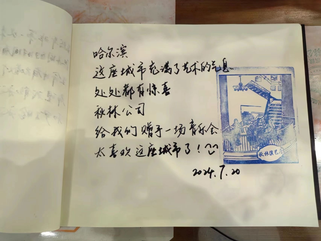 “第一次来,对这座城市印象很好~会再来的!也祝秋林公司越来越好!红肠很好吃~格瓦斯很惊艳!!”7月20日,看了百年老物件展、品尝了秋林特色美食后,几名上海游客在打卡区及时留下此行感触,“哈尔滨这座城市充满了艺术气息,处处都有惊喜,秋林公司给我们赠予一场音乐会,太喜欢这座城市了!”