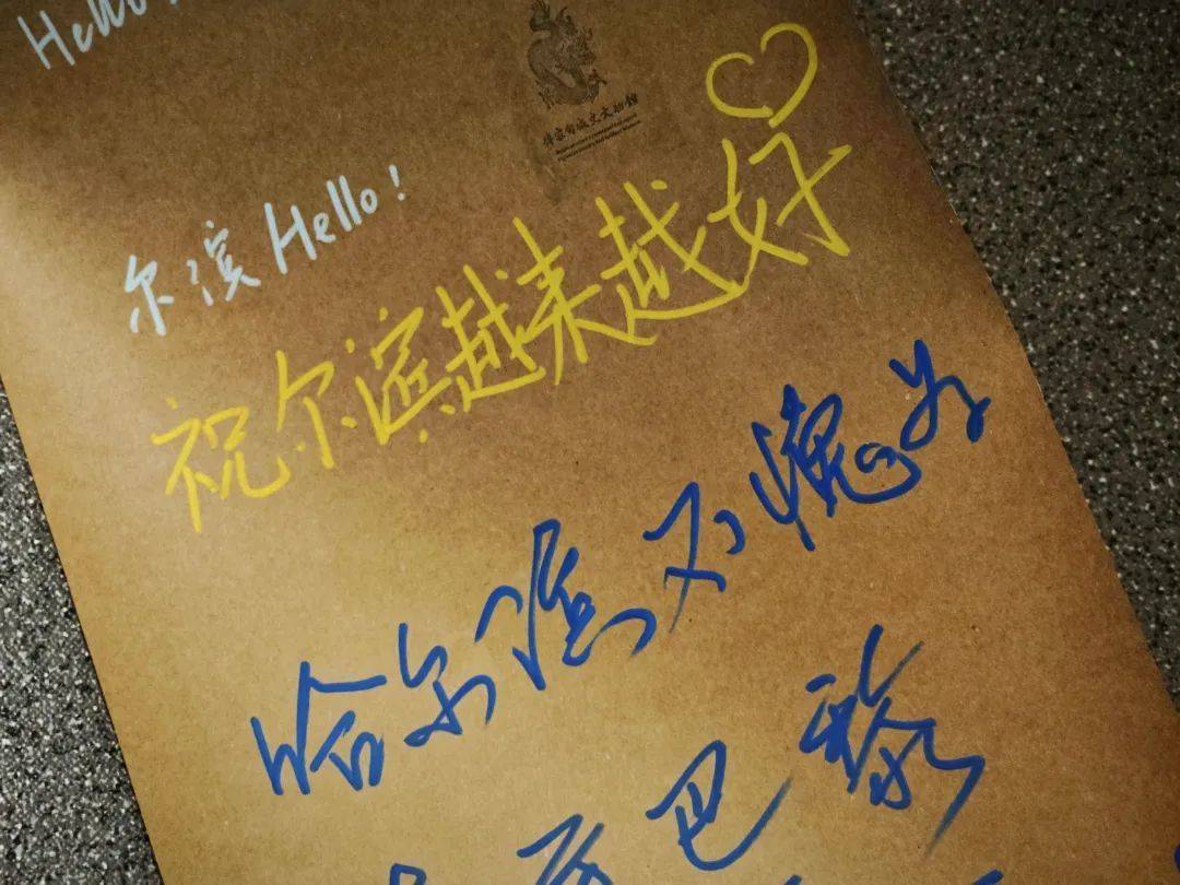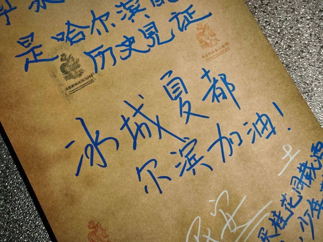 在博物馆一楼与二楼交界处,牛皮纸卷轴悬挂于墙上,只要轻轻转动,就可以看到更多游客的互动留言,附近的小桌上,摆放着供游客使用的留言笔,以及多个博物馆原创、可免费留念的印章。展开“留言簿”,来自佛山、承德、甘肃、天津、宁夏等地的游客纷纷互动,大家写下“祝‘尔滨’越来越好”“我爱哈尔滨,明年我还来”“感受到了‘尔滨’的热情”等对“尔滨”的“告白”,还有“哈尔滨红肠贼好吃”“铁锅炖嘎嘎香”等对特色美食的喜爱,更有“为梦想前进,考上哈工大”等对“尔滨”名校的期盼。