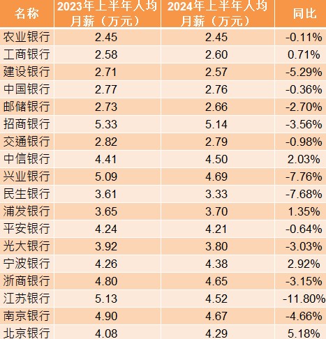 如果不考虑各家银行人数加权平均,仅以各家银行人均薪酬绝对值进行比较,A股上市银行2024年上半年人均月薪为3.43万元,与去年同期相比下降2.18%。如果换算为绝对值,相当于每位银行员工月薪下降764元。