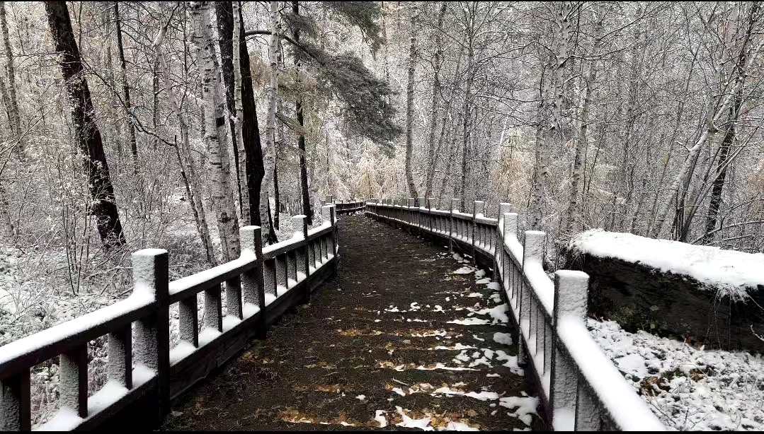 一夜之间,突如其来的一场秋雪,让原本深绿、金黄、绯红的山野,都覆盖上了白茫茫的雪花,恰到好处地为秋色点缀了絮白,让秋色又多了一层意境,既有秋的温婉,也有初冬的风韵。