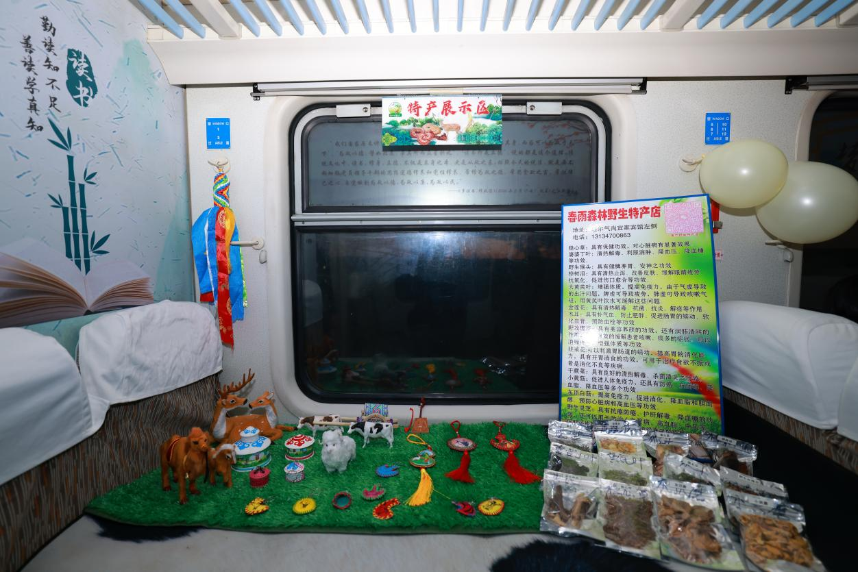 2024年,“慢火车”进入了新发展阶段,依托铁路线,沿线乡镇市集规模不断扩大,各类山货采买层出不穷,每到开集,附近村民就会乘坐“慢火车”带着各类应季山货从四面八方赶来,与乘坐列车的人们来一场或发生在车厢、市集上的买卖。为了搭建一个良好的交易平台,年初,列车乘务人员在车厢两端信息栏上增设了野生特产介绍栏,并在4号车厢最后一个座位处搭建临时的山货特产展示区,将沿线百姓提供的桦树泪、金莲花、野生猴头、木耳等12种代表特产样品以及摆件物品摆放在此处,途中,列车乘务人员协助秩序,供大家挑选。