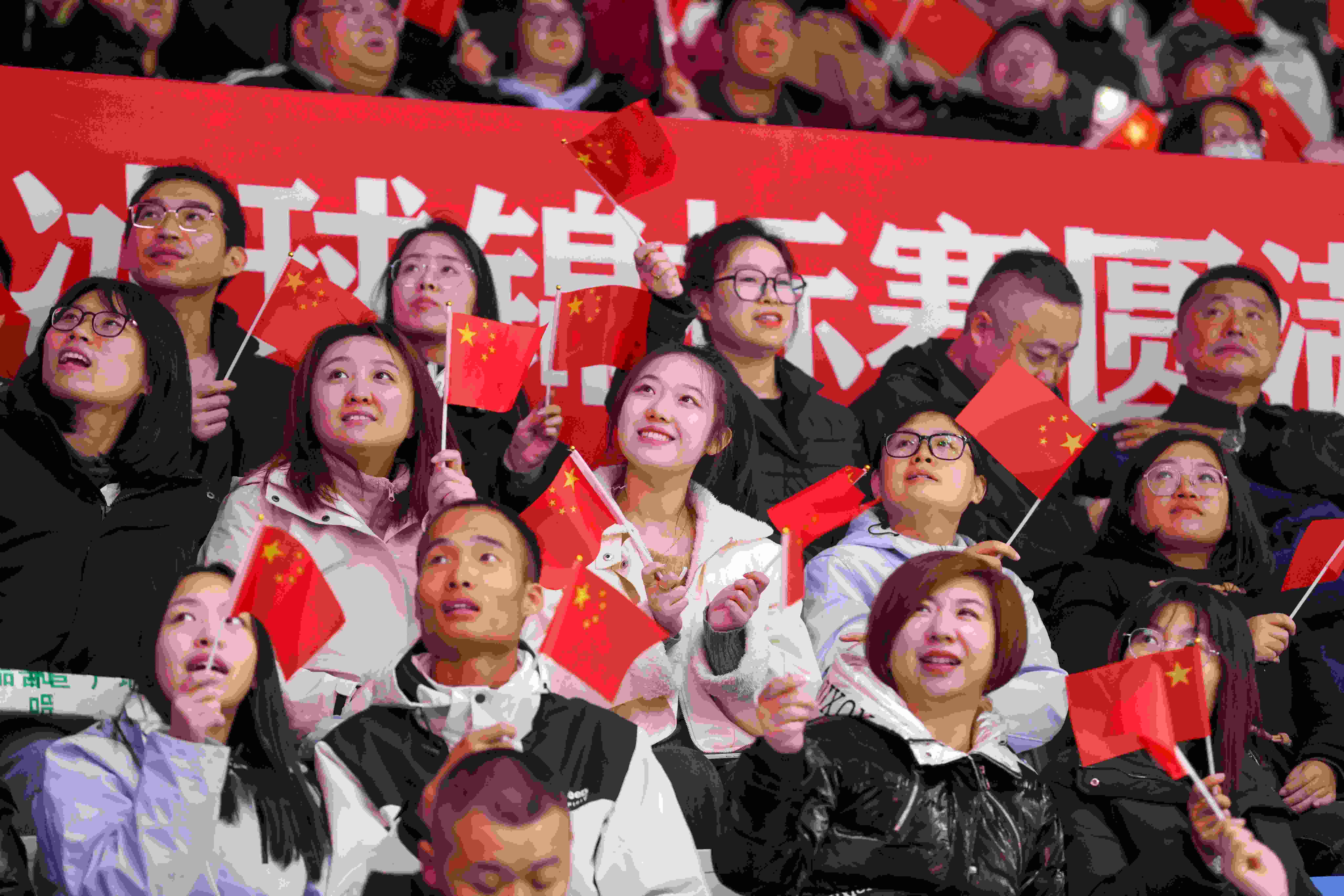场上的热烈气氛也传染了每一个观看比赛的球迷,双方拥趸纷纷大声呼喊为支持的球队加油助威,同时在场间休息时,更是在现场DJ的带动下,挥舞着国旗唱起《歌唱祖国》《我爱你中国》等歌曲,为即将到来的祖国成立75周年祝贺。