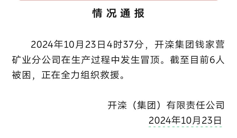大皖新闻讯 10月23日凌晨,位于河北省唐山市的开滦集团钱家营矿业分公司在生产过程中发生冒顶导致6人被困,被困者的安危也牵动众人心。10月23日深夜,大皖新闻记者抵达事发地看到,该公司门口有交警和安保人员值守,现场一位民警称,救援工作仍在持续,被困者尚未被救上来。