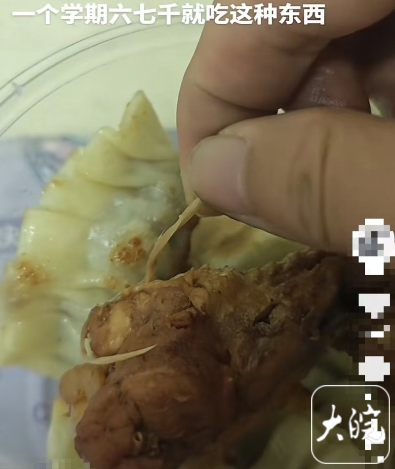 大皖新闻记者注意到,该家长发布的视频中,餐盒中的鸡腿上有两根细长的白色异物,疑似未清理干净的鸡毛。