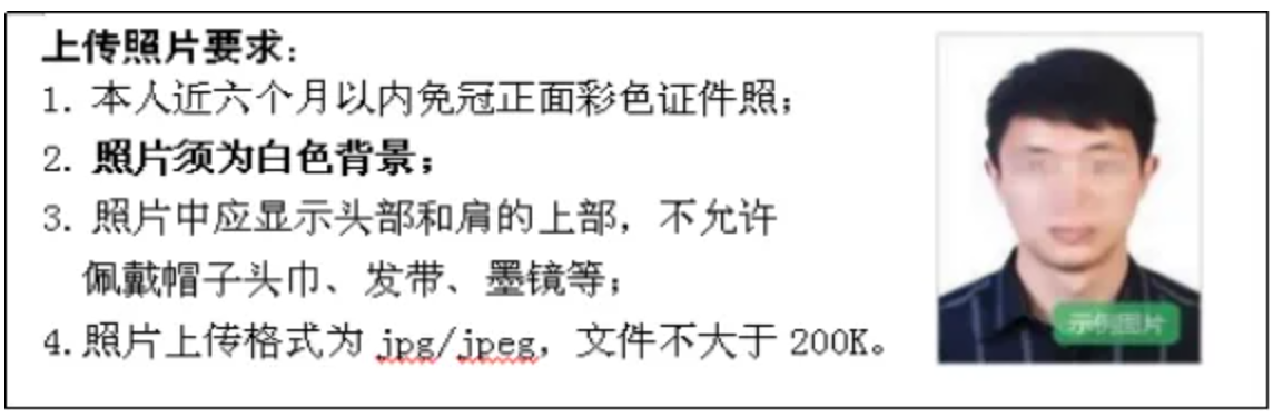 3.照片上传:照片将用于准考证以及考试合格证明,请考生上传照片时慎重选用。照片不合格的考生审核将不能通过。
