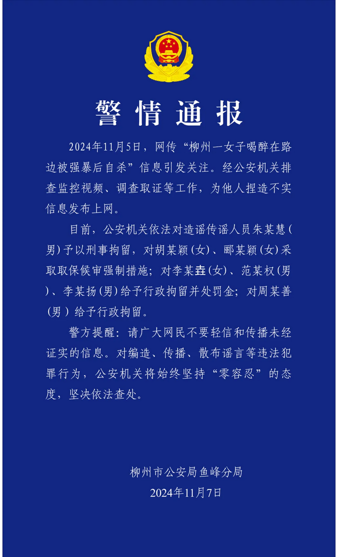 大皖新闻讯 据柳州警方微信公众号消息,11月7日,柳州市公安局鱼峰分局发布警情通报。具体如下: