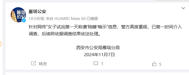 大皖新闻讯 据@雁塔公安官方微博消息,11月7日,西安市公安局雁塔分局发布通报:针对网传“女子试岗第一天称遭'陪睡'暗示”信息,警方高度重视,已第一时间介入调查,后续将依据调查结果依法处理。