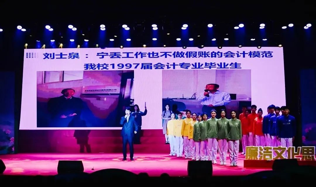 汇报会以《清风沐桃李 廉洁润初心》专题片开场,全面总结回顾了一年来学校廉洁文化建设的丰硕成果。汇报环节分为“源”“颂”“传”三个篇章,融合思政课展示、原创歌曲、大合唱、舞蹈、音舞诗画、话剧等多种艺术表现形式,追溯廉洁文化根脉,讴歌传颂清廉精神,弘扬崇尚廉洁良好风尚,唱响廉洁文化建设主旋律。
