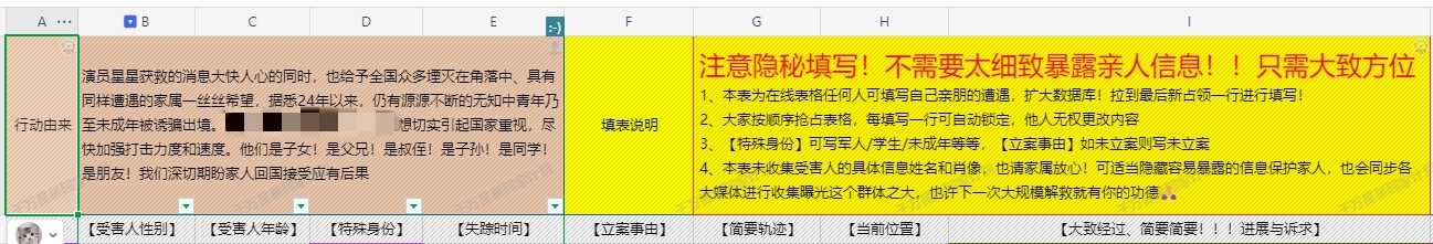 维度新闻记者在该表格中看到,表格需要填写的内容包括受害人性别、年龄、身份、失踪时间、立案事由、简要轨迹、进展与诉求等信息。