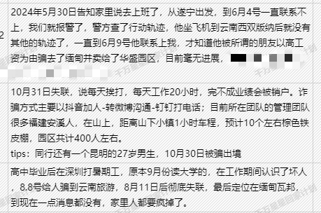 据该文档发起人戴女士介绍,在线文档是在1月9日向全社会公布,目的是想扩大数据库,希望帮助更多的受害同胞。“我是这份文档的发起者,也是众多受害者之一,建群的初心是抱团取暖,建文档的初心也是一样!除群友之外,我们还陆陆续续收到各个社交媒体上发布的求助信息,我们想聚沙成塔!并且想更正公众对于“缅北已不存在诈骗园区”这些不实的消息,因为仍有国人被骗过去,并且提醒公众不要受骗。”