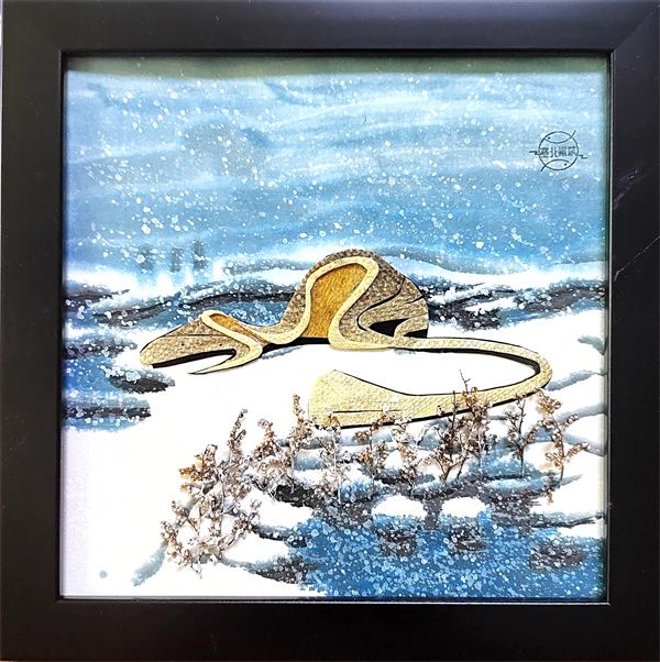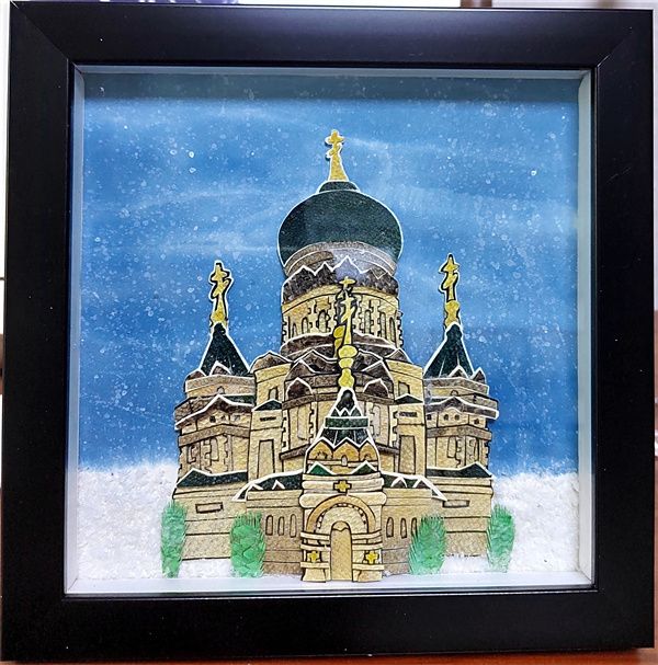 在非遗鱼皮展台,鱼皮画、鱼皮钥匙扣、鱼皮挂件、鱼皮耳钉项链等都充满了地方冰雪元素:亚冬会吉祥物,哈尔滨标志性建筑,雪花、鄂温克族与驯鹿,鄂伦春族与森林,赫哲族渔猎,一幅幅生活化的场景通过鱼皮画生动地展现了出来……将冰雪绘画与鱼皮相结合一直是省级鱼皮画代表性传承人石立新的创作重点,索菲亚教堂、防洪纪念塔、大剧院、太阳岛等哈尔滨地标性鱼皮画作品是这几年的爆款产品。为了不断提升作品呈现的效果,石立新作品选取的视角是从空中俯瞰,这样画面更立体,更好看。“在创作之前,我会反复观看不同航拍作者的照片和视频作品,选取最佳角度切入。”石立新说,“我用不同颜色的鱼皮做建筑主体,按照鱼皮的自然纹理巧妙绘制出建筑不同的明暗结构,尤其是鱼皮菱形格将大剧院玻璃屋顶完美呈现出来。在漫天飞雪的背景下,将哈尔滨最美的瞬间浓缩在相框中,只要看到鱼皮画,就能让游客想起在哈尔滨的点点滴滴。”