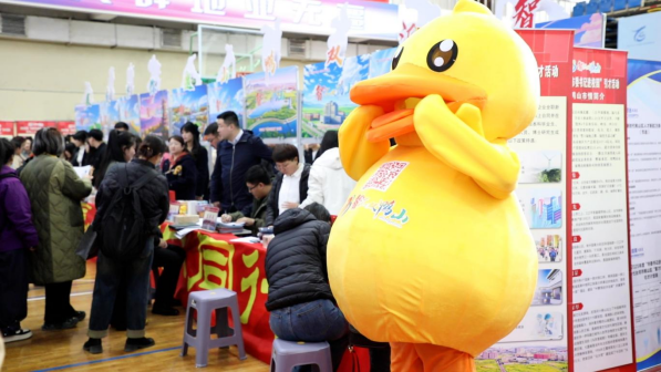 引赴约“活水”聚人气。现场两条宣传条幅高悬于大屏两侧,“纳贤汇智双鸭山·齐书奋进新华章”“邀才逐梦双鸭山·共绘发展新画卷”标语传递着求贤若渴之意;文创礼品整齐摆放,寓意绿水青山的胸针、代表地域特色的小黄鸭、象征抗联精神的七星神鹿……承载着独特的文化底蕴,更彰显着爱才的拳拳之意。憨态可掬的招才“吉祥物”——小黄鸭穿梭在人群中,与学子们进行热情交流;引才小分队成员耐心解答着薪资待遇、生活环境等问题。广阔的发展前景、优质的岗位机遇,成功吸引众多学子驻足咨询、投递简历。截至目前,初步达成就业意向有近900人。