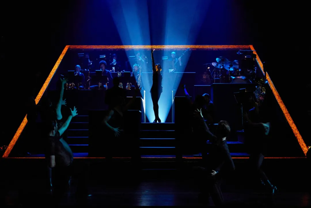 《芝加哥》的舞台其实纵向空间很大,乐队的台阶将舞台一分为二,剧情可以在前方舞台和乐队舞台上同时发生。