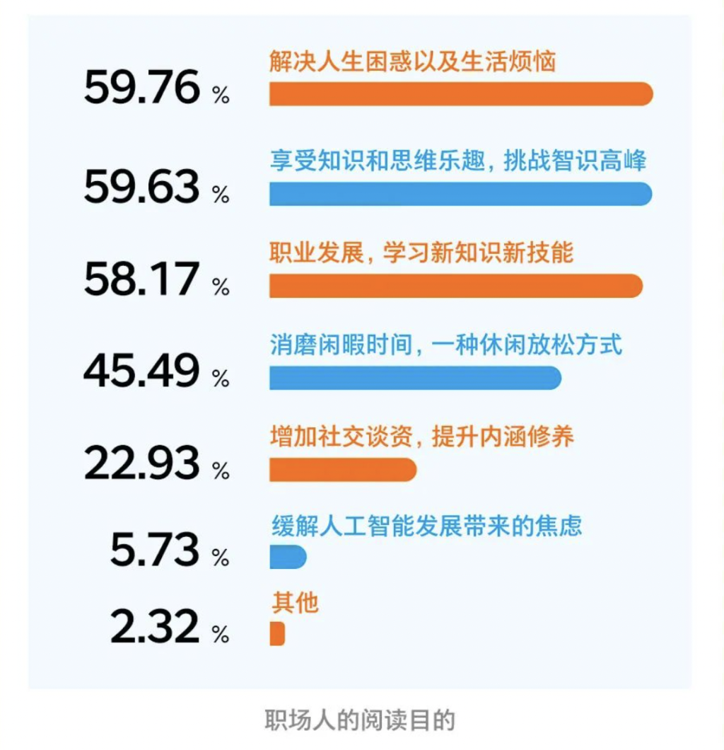 在职场人阅读目的的多选题中,解决人生困惑以及生活烦恼(59.76%)、享受知识和思维乐趣以及挑战智识高峰(59.63%)、职业发展和学习新知识新技能(58.17%)占比接近,是职场人阅读的最主要目的。