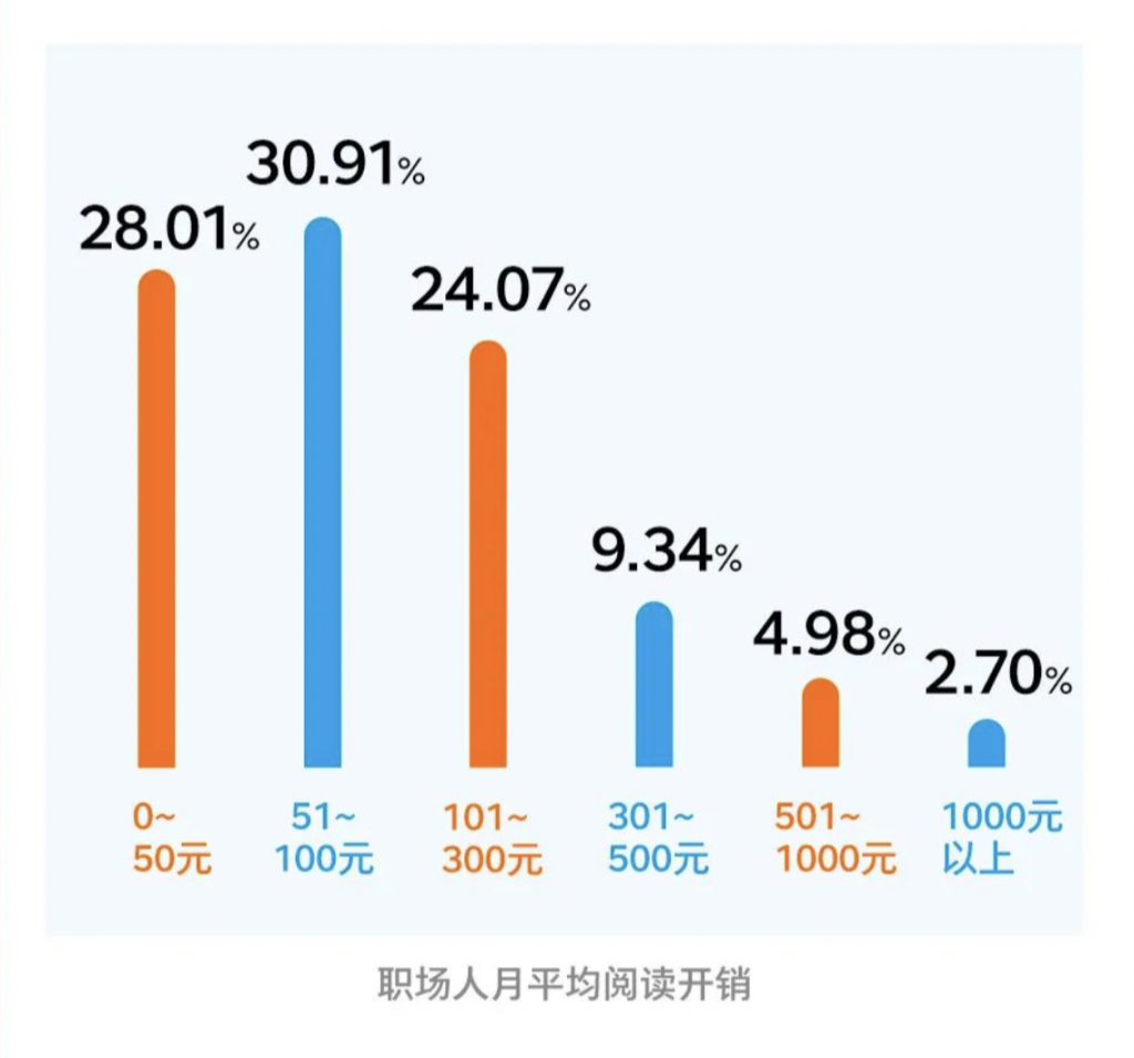 从报告中还可以看出,近60%的受访职场人每月在图书购买方面的花费为0到100元。总体来说,职场人的购书开销占收入的比例并不高。同去年的报告数据相比,月平均图书开销超过100元的人数占比从45.91%下降至41.09%。