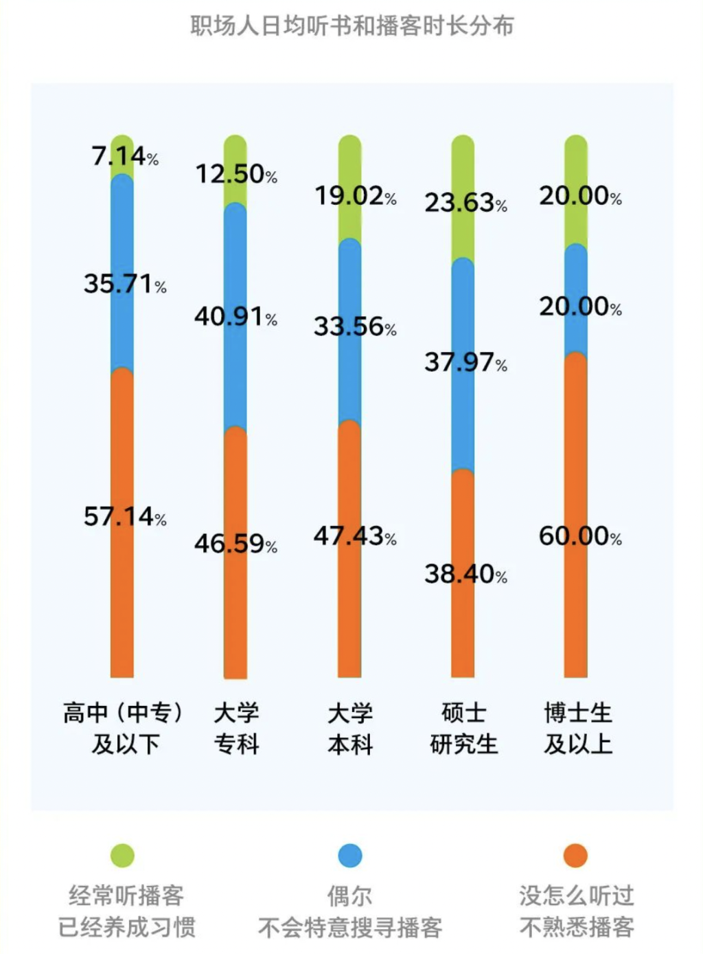 报告还显示,大学本科以上学历的职场人经常听播客的人数占比要高一些,在20%左右。有意思的是,在博士研究生学历的职场人中,经常听播客的有20%,同硕士研究生学历23.63%的比例差不多,但是却有60%没怎么听过播客,远高于硕士研究生学历的38.4%。
