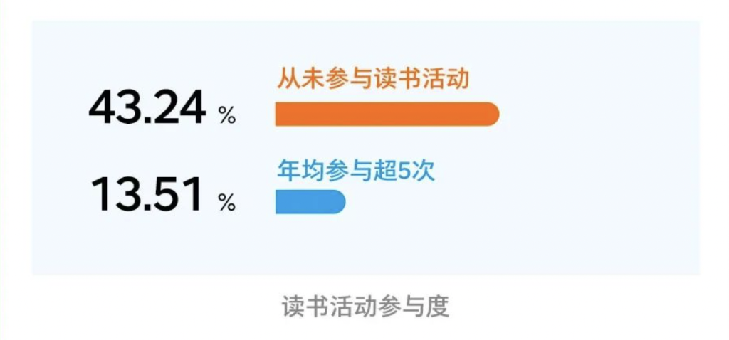 报告显示,Z世代职场人阅读人数占比较去年有所下降,从24.9%下降至19.9%。不过13.51%的Z世代受访者表示年均会参与超过5次的读书活动,并且这部分职场人的人均阅读量是其他群体的三倍。所以Z世代中还是有一定数量的“读书种子”。