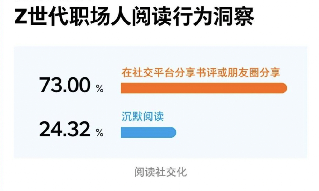 在《2025职场人阅读报告》中,专门还附有一份“Z世代(25岁-29岁)职场人阅读行为洞察”的延伸报告。其中显示,73%的Z世代职场人选择在社交平台分享书评或者在朋友圈分享,相较而言,Z世代的阅读社交化还是比较高的。不过这也不一定是所谓Z世代的特点,可能还是因为他们年轻,热衷于社交。