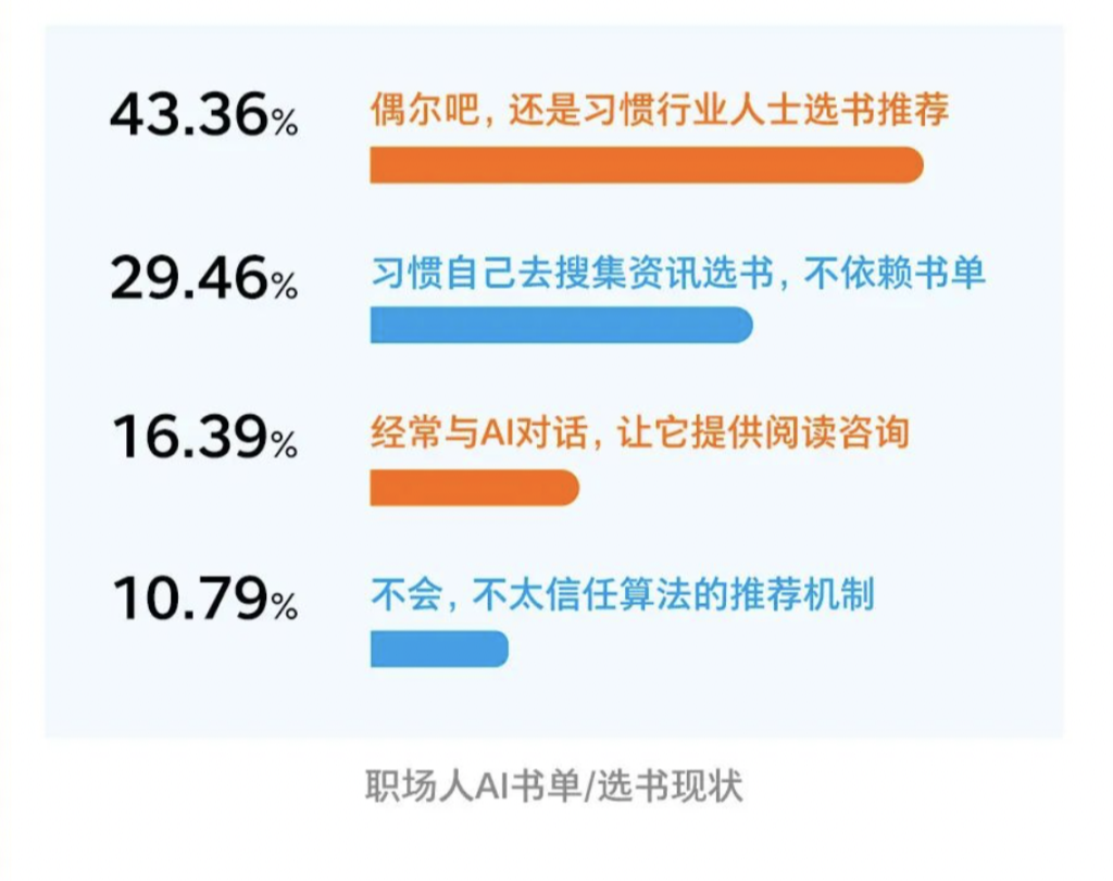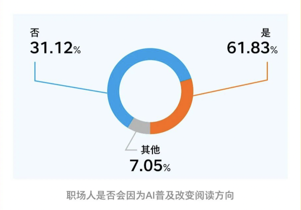 报告中还提及AI目前对于阅读的影响。比如涉及职场人如何选书的问题,16.39%的职场人表示经常与AI对话,让其提供阅读推荐。更有61.83%的职场人会因为AI普及而改变阅读方向。