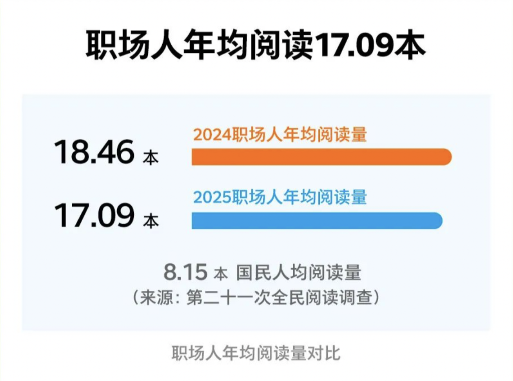 自2019年起,由出版品牌“湛庐文化”提议、《中国出版传媒商报》作为行业指导、多家文化和互联网公司共同发起了“职场人阅读调查”,每年进行一次。今年4月23日,“湛庐阅读”发布了基于“职场人阅读调查”数据的《2025职场人阅读报告》,此次参与调查者超过一万人。
