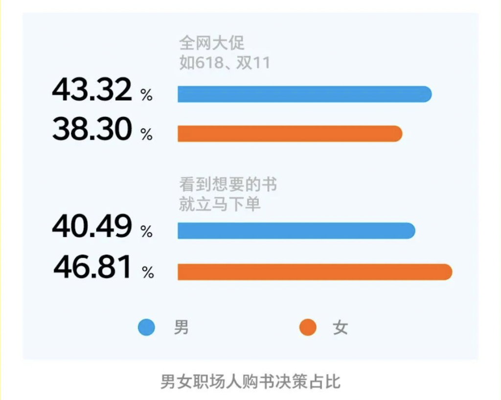 在职场人购书时机的调查问题中,43.32%的男性读者选择在全网大促的时候购书,而只有38.30%的女性会做出同样的选择。在“看到想要的书就立马下单”的问题中,有46.81%的女性给出肯定答案,而只有40.49%的男性做出同样选择。可以看出,相较而言,职场中的女性更容易冲动买书,而非理性计划。