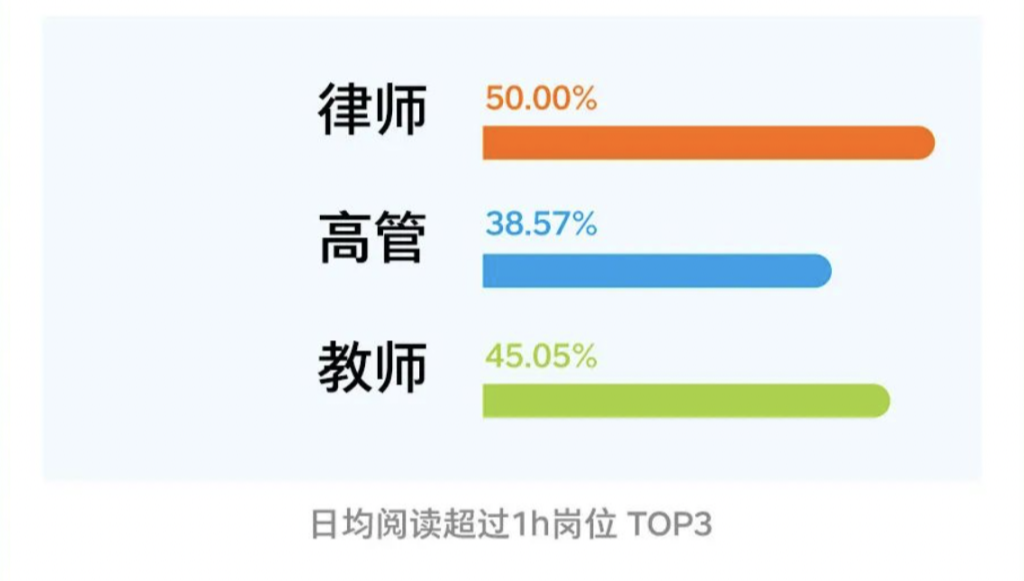 这份报告显示,有72.89%的受访者日均阅读时长超过30分钟。在日均阅读时长超过1小时的人群中,有三个岗位占比排名最靠前——律师、高管和教师。其中50%的受访律师日均阅读时长超过1小时。