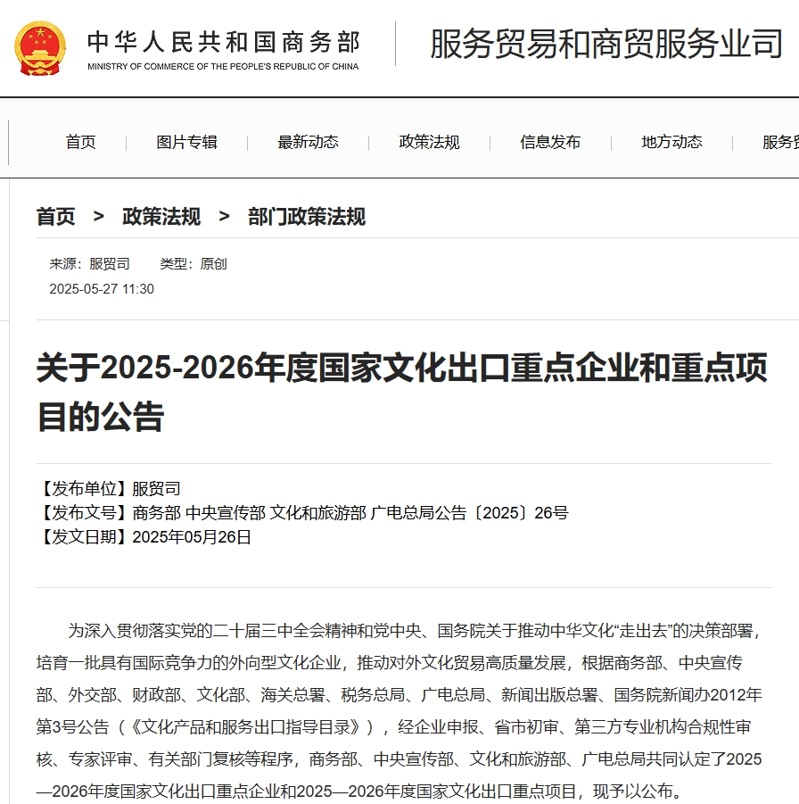近日,商务部发布《关于2025-2026年度国家文化出口重点企业和重点项目的公告》,经企业申报、省市初审、第三方专业机构合规性审核、专家评审、有关部门复核等程序,商务部、中央宣传部、文化和旅游部、广电总局共同认定了2025—2026年度国家文化出口重点企业和2025—2026年度国家文化出口重点项目。其中,黑龙江2家企业入选。