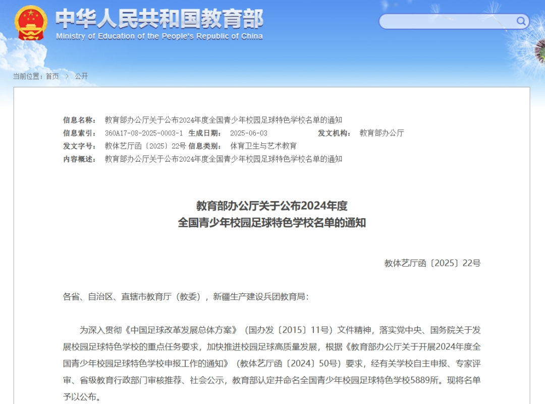近日,教育部网站公布2024年度全国青少年校园足球特色学校名单。经有关学校自主申报、专家评审、省级教育行政部门审核推荐、社会公示,教育部认定并命名全国青少年校园足球特色学校5889所。其中,黑龙江114所学校入选。