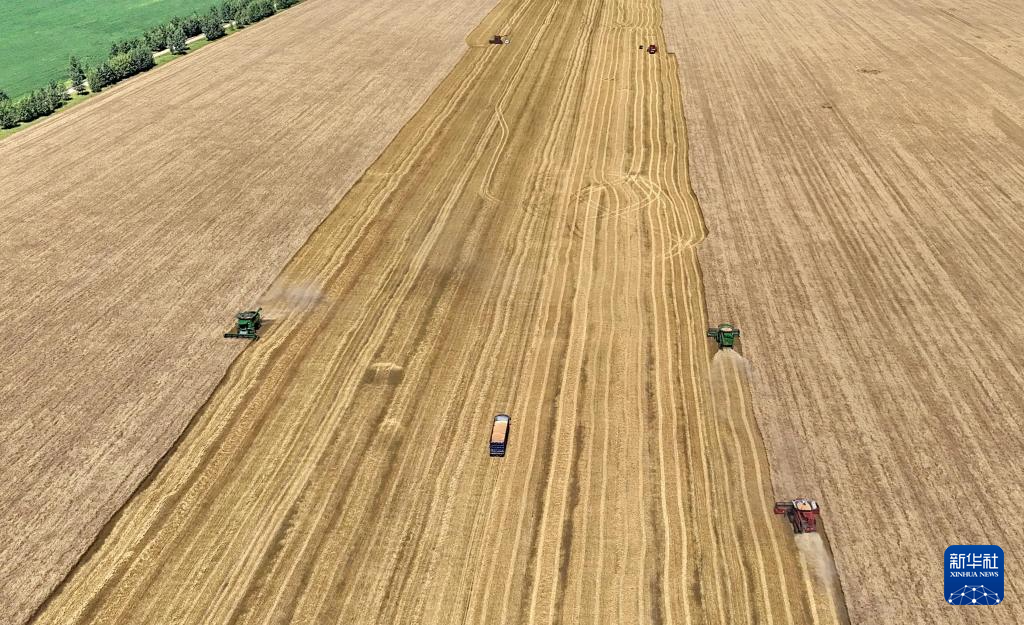 8月5日,在北大荒集团黑龙江红星农场第二管理区,大型收割机在抢收小麦(无人机照片)。新华社发(侯越摄)