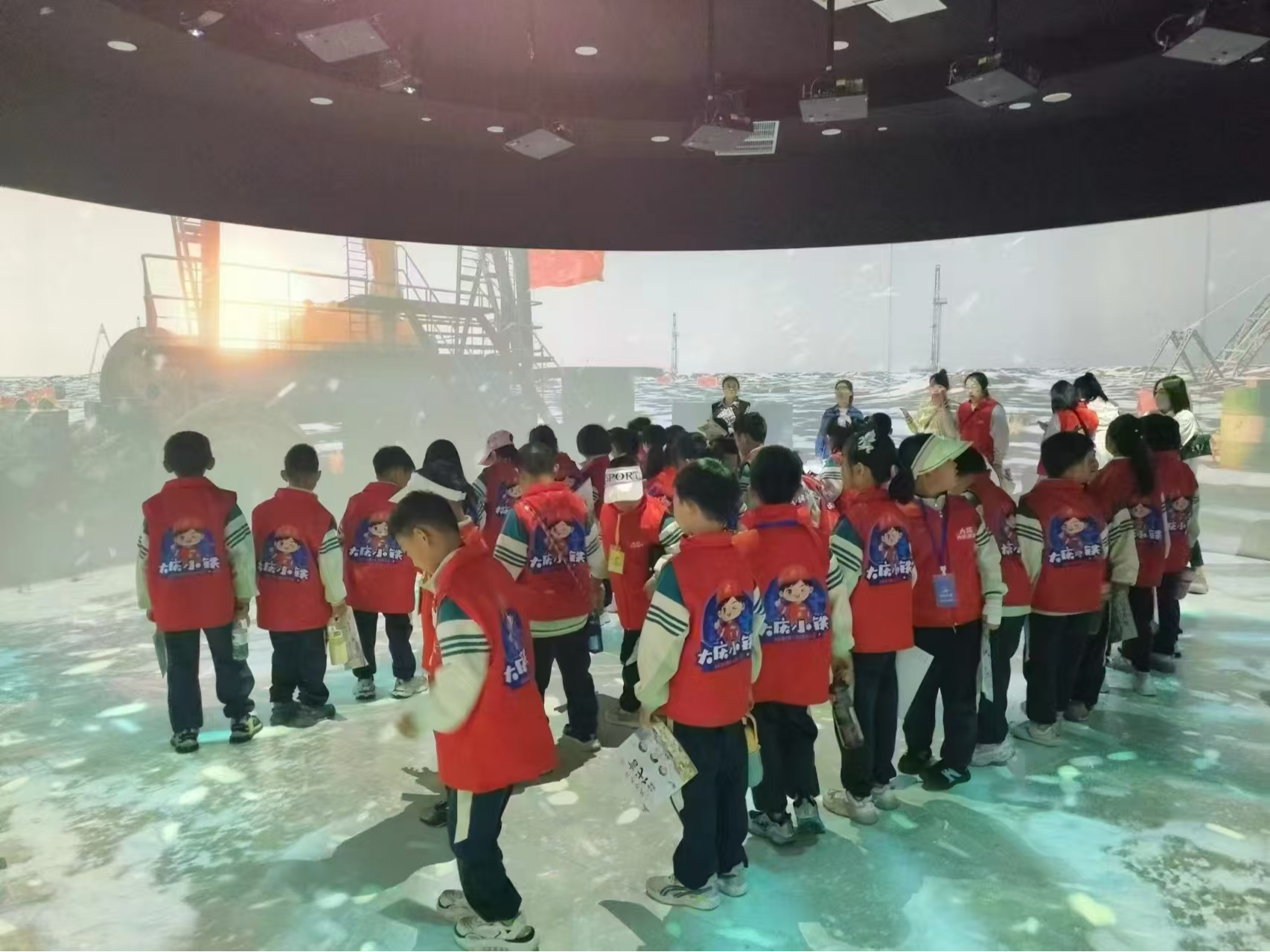 大庆全域旅游服务体验中心是设计者结合线上智慧旅游服务平台、城市宣传、数据中心等功能,打造全域旅游+智慧旅游+赋能研学的“沉浸式”旅游综合体。体验中心利用轨道镜投影和全息影像体验,游客可以循着时间长河,纵览“百湖之城”和“石油之都”的演变过程。在了解大庆是如何形成之后,观看360度环幕短片“大爱无疆”,可以更直观地了解“宁可少活二十年,拼命也要拿下大油田”的大庆精神、铁人精神。