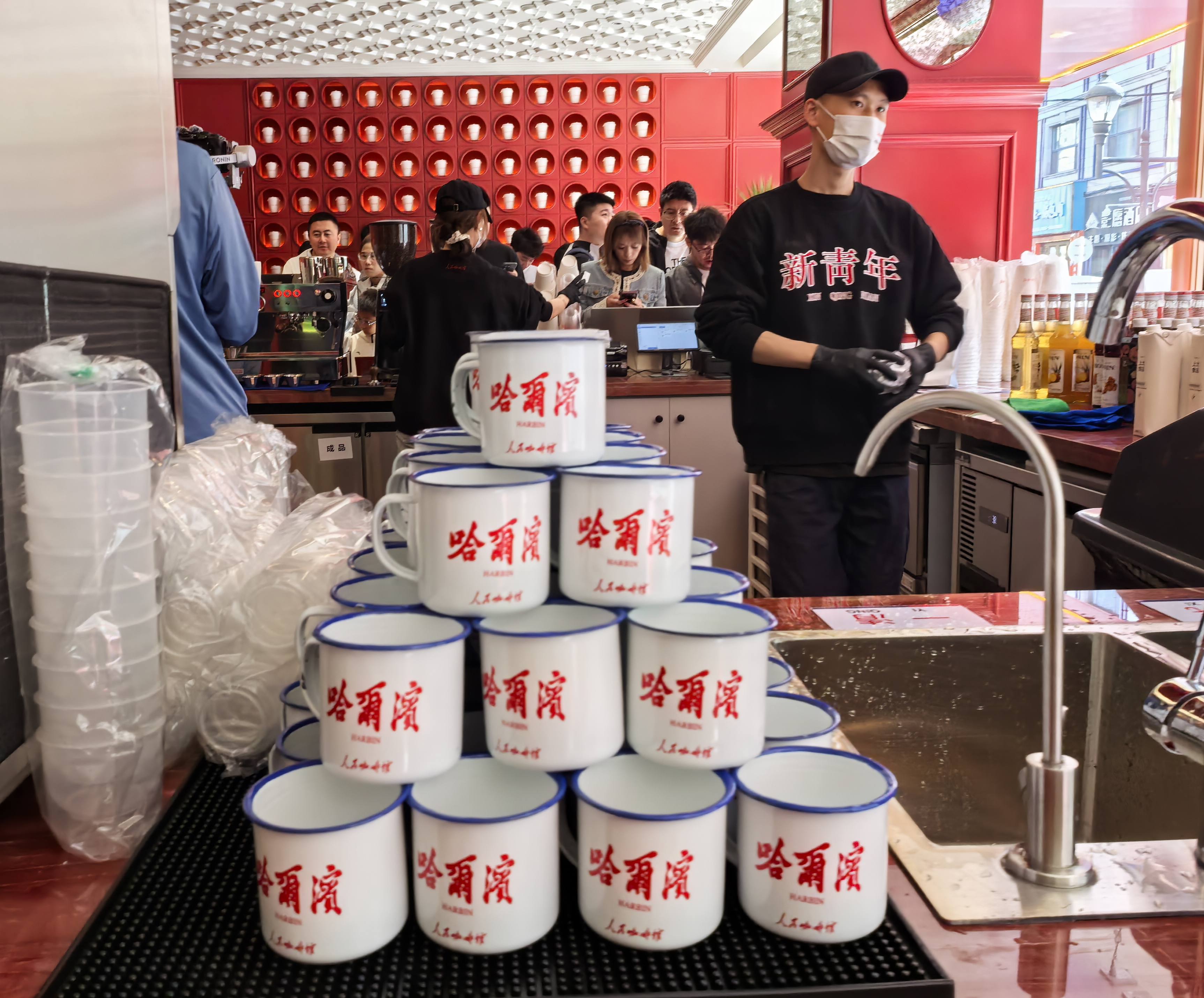 品牌负责人魏嘉安介绍,门店核心竞争力源于三大专属体系:独立设计的VI系统实现门头标识、空间装饰的主题统一,融合书法字体与西式拱券元素强化辨识度;定制化产品矩阵中,遇热呈现“老街新韵”字样的杯套成为亮点,杯身融入中央大街建筑元素,搭配东北风味限定饮品,兼具实用与传播价值;场景设计上,互动打卡墙结合面包石纹理与红色符号,更提供“咖啡+街区导览”增值服务,延伸消费体验。