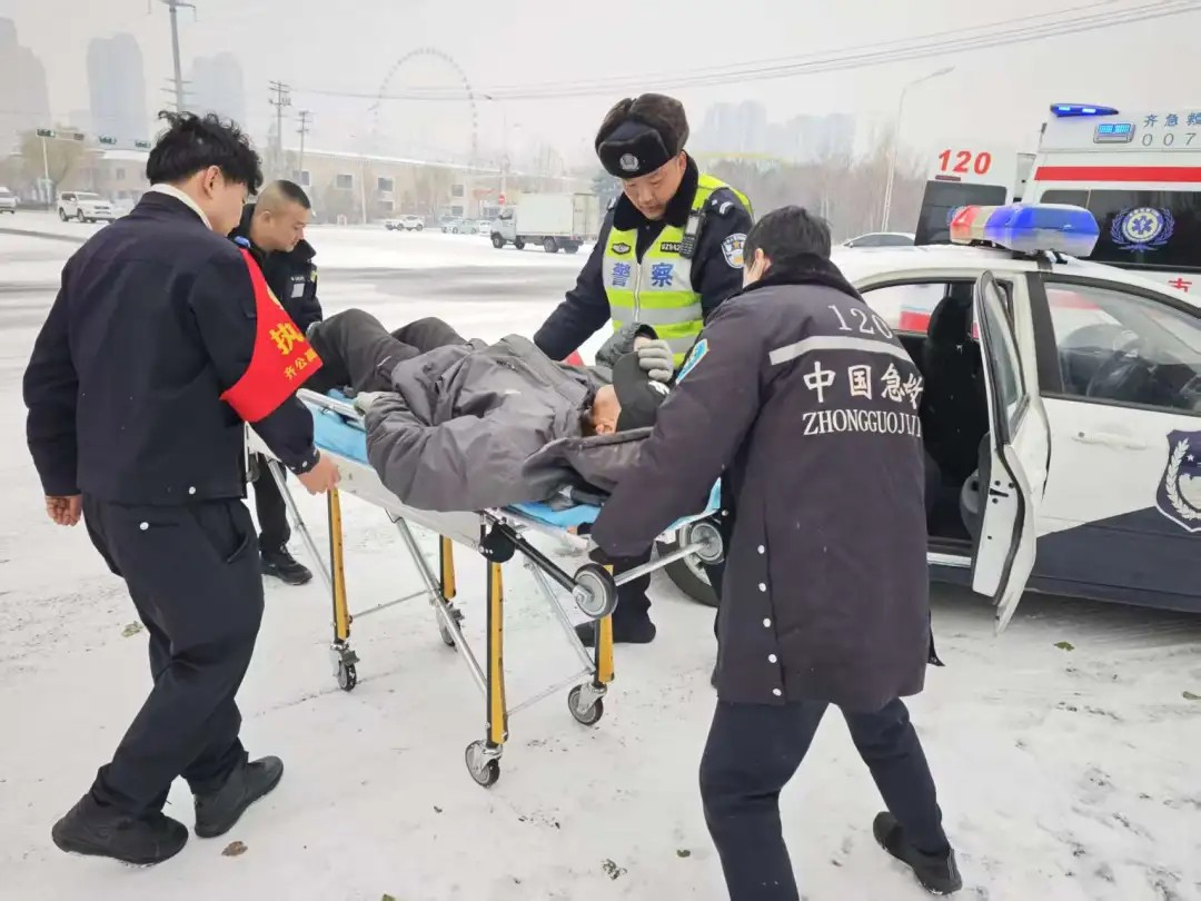 风雪中,交警及时伸出援手。龙沙大队民警巡逻中发现一名老人倒地,立即守护并联系120救助,最终协助送医并联系到家属。